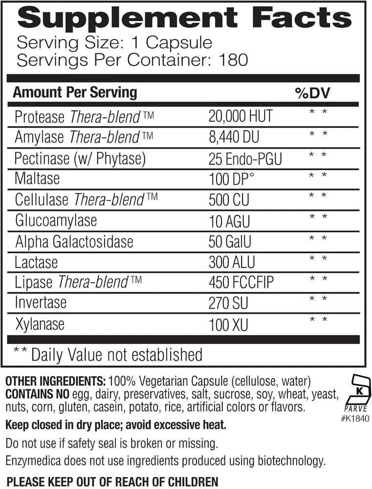 Innehåll: Protease Thera-blend, Amylase Thera-blend, Pektinas (med Fytas), Maltas, Cellulas Thera-blend, Glucoamylase, Alfa-galaktosidas, Laktas, Lipas Thera-blend, Invertas , Xylanase