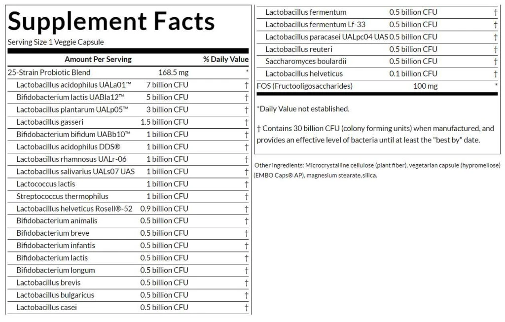 | Ingredienser | Hydroxipropylmetylcellulosa, kiseldioxid, magnesiumstearat, mikrokristallin cellulosa, bifidobacterium animalis, Bifidobacterium bifidum UABB10, bifidobacterium breve, bifidobacterium infantis, Bifidobacterium lactis, Bifidobacterium lactis UABLA12, Bifidobacterium longum, Bulgarisk laktobacillus, fruktooligosackarider, lactobacillus acidophilus dds, Lactobacillus acidophilus uabla01, Lactobacillus brevis, lactobacillus casei, lactobacillus fermentum, lactobacillus fermentum lf-33, lactobacillus gasseri, lactobacillus helveticus, lactobacillus helveticus rosell-52, lactobacillus lactis, lactobacillus paracasei ualpc04 uas, lactobacillus plantarum ualp05, Lactobacillus reuteri, lactobacillus rhamnosus ualr-06, lactobacillus salivarius uals07 uas, Saccharomyces boulardii, termofil streptokock |