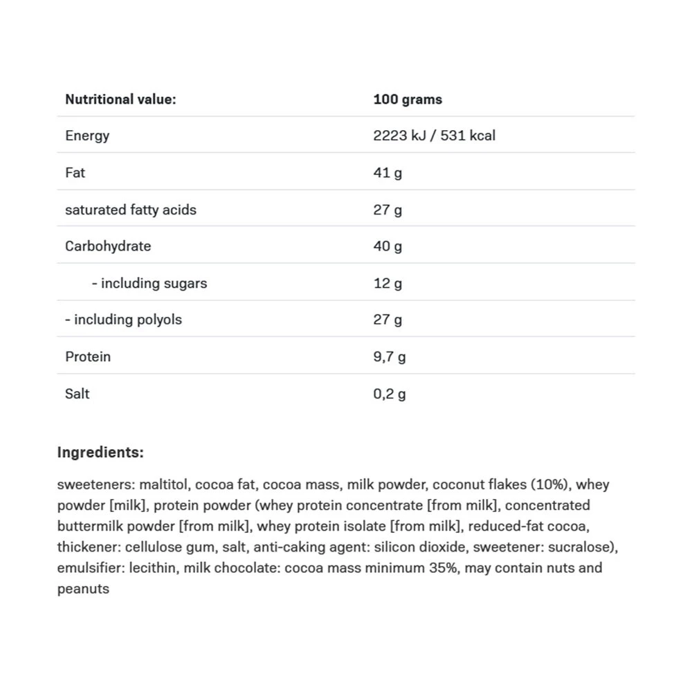 Denna premiumchokladbar innehåller högkvalitativa ingredienser som valleprotein koncentrat (WPC) och valleprotein isolat (WPI), vilka båda är kända för sina proteinrika egenskaper. Kokosen ger en naturlig sötma och tropisk känsla, vilket gör varje tugga till en ren njutning.