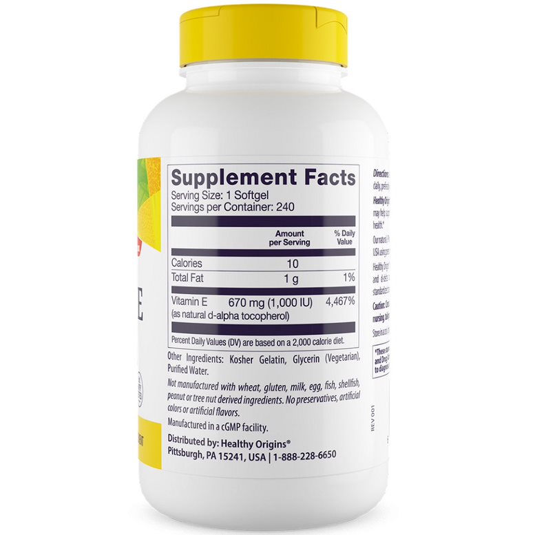 Huvudingrediensen i Healthy Origins E-1000 Depot är vitamin E, en viktig antioxidant som skyddar kroppens celler från oxidativ stress.