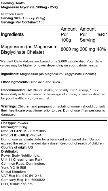 Seeking Health – Magnesiumglycinat, 200 mg – 250 g