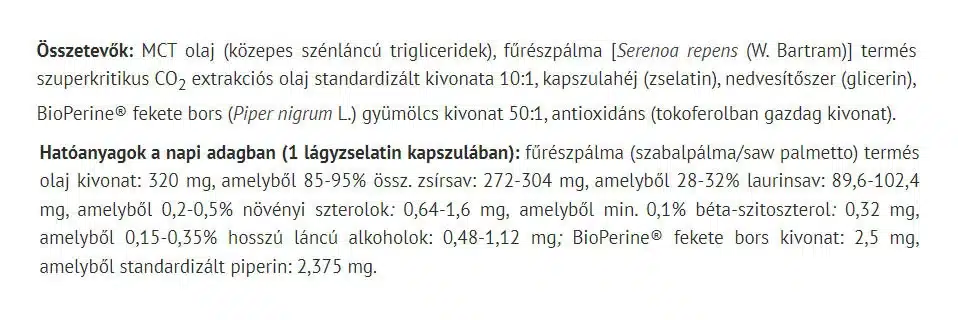 Huvudingrediensen i detta tillskott är olja från sågpalmetto, en växt som traditionellt har använts för att stödja olika aspekter av hälsan.Produkten är framställd för att bibehålla hög kvalitet och renhet.