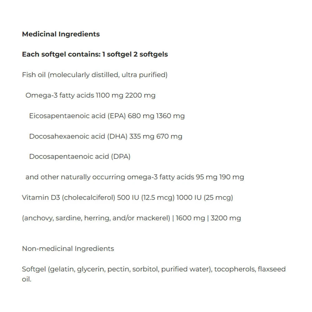 Denna produkt innehåller Omega-3 fettsyror från fiskolja,kända för sina positiva effekter på hjärt-kärlsystemet. Vitamin D, som extraheras från lanolin (fårull), bidrar till immunsystemets normala funktion samt till normal benstomme och muskelfunktion. Båda ingredienserna är essentiella för att upprätthålla en balanserad hälsa.