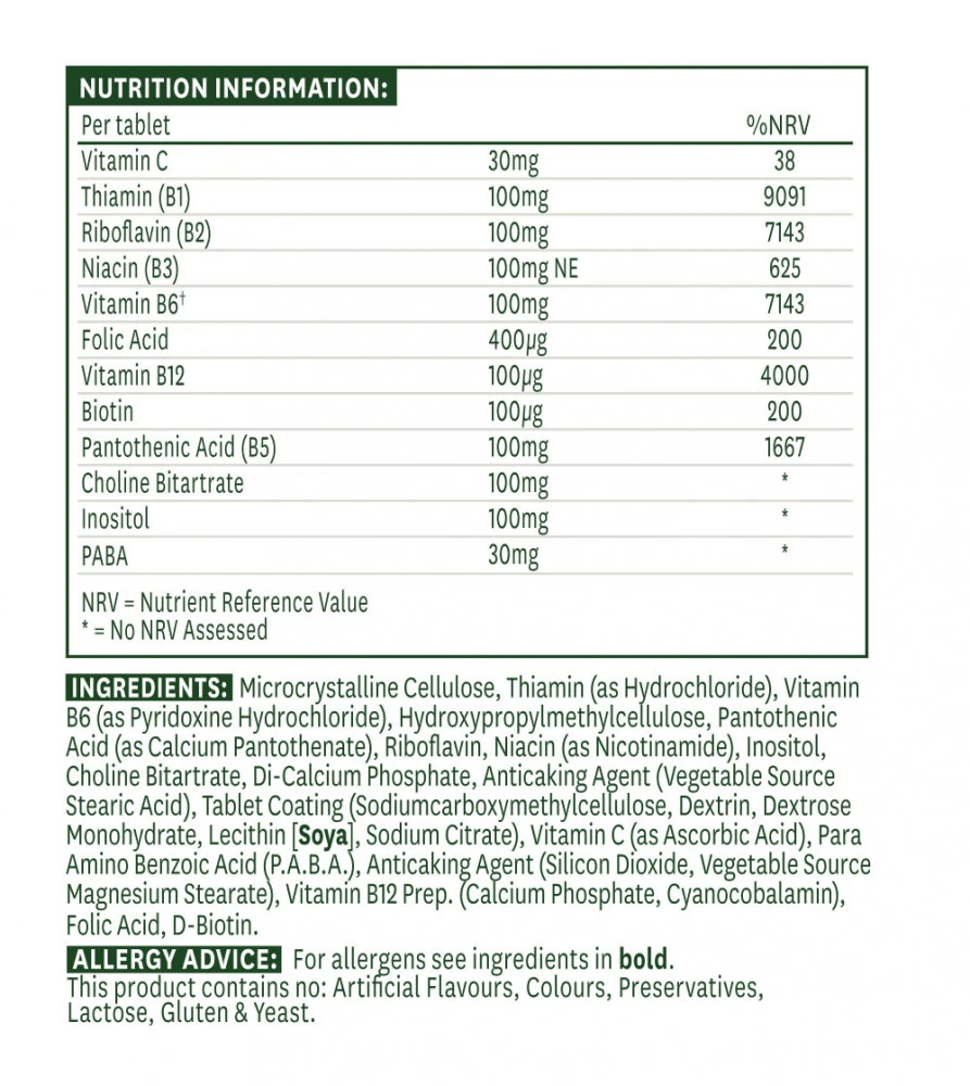Natures Aid Vitamin B Complex 100 innehåller en noggrant utvald kombination av essentiella B-vitaminer inklusive tiamin (B1), riboflavin (B2), niacin (B3), pantotensyra (B5), pyridoxin (B6), biotin (B7), folsyra (B9) och kobalamin (B12). dessa ingredienser är sammanställda för att ge optimalt stöd till kroppens energiproduktion och nervsystem.