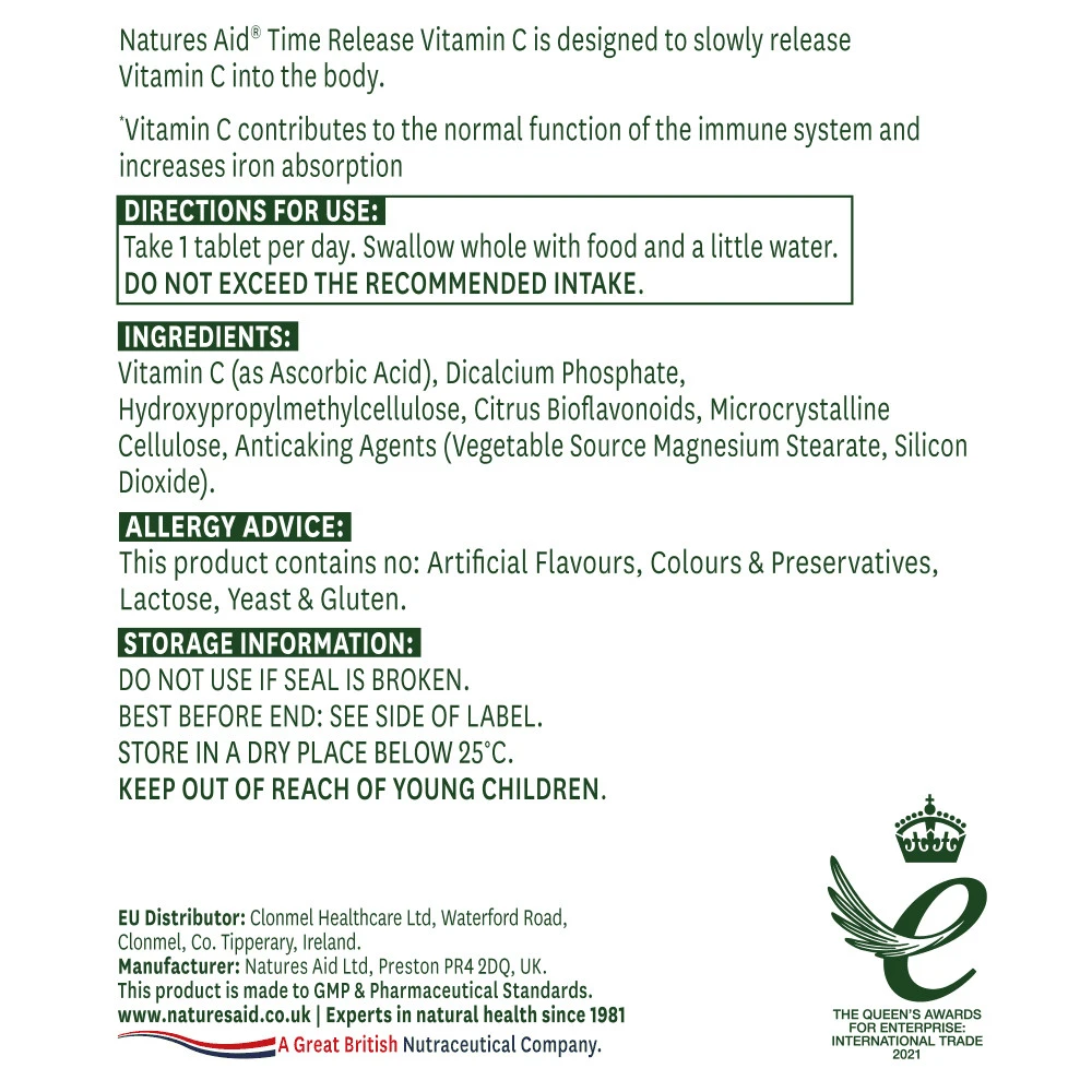 upptäck kraften i Natures Aid Vitamin C 1000mg time Release, ett högkvalitativt kosttillskott som är utformat för att ge en jämn frisättning av vitamin C under dagen. Perfekt för dig som söker ett veganskt alternativ för att stödja ditt immunsystem.