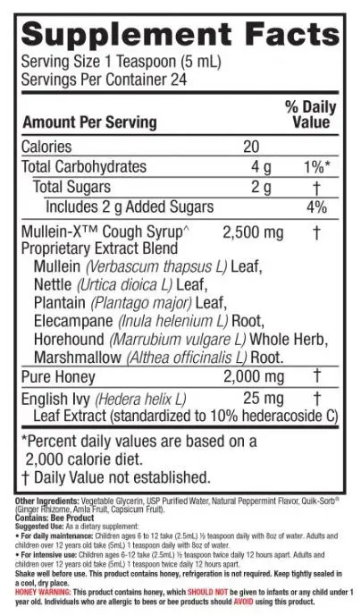 Mullein-X Cough Syrup innehåller en blandning av traditionellt använda örter som kungsljus (Verbascum thapsus). Kungsljus har länge använts inom folkmedicinen för dess välgörande egenskaper.
