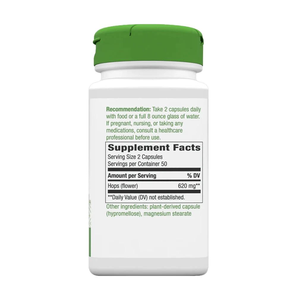 | Näringsinnehåll | Portionsstorlek: 2 veganska kapslar, Antal portioner per förpackning: 50 Humle (blomma): 620 mg, Dagligt värde ej fastställt. |