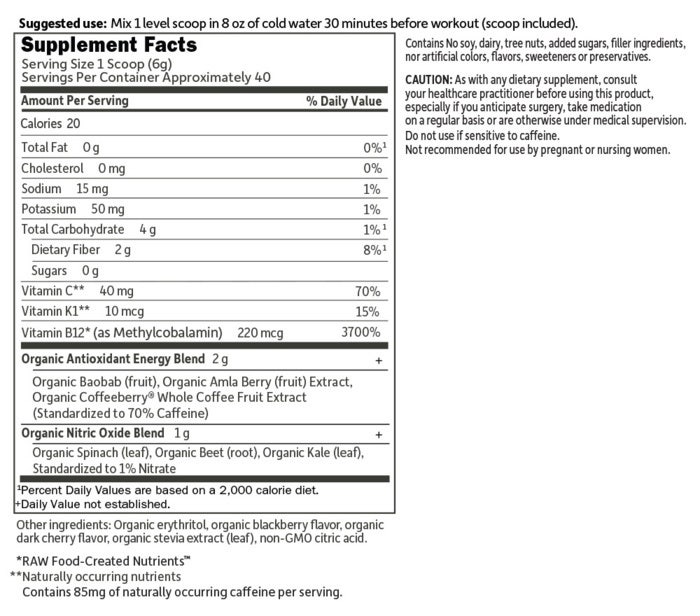 Visste inte ens att kaffebär var en verklig ingrediens men jag antar att detta är en naturlig form av koffein. Denna produkt är lämplig för veganer och vegetarianer eftersom ingen av ingredienserna kommer från djur, även vitaminerna utvinns från växter så om du menar allvar med att undvika animaliska produkter så är det den här du bör ta som ett före träningspass. Jag älskar att kväveoxidingredienserna i detta är spenat, betor och grönkål.. inte konstigt att popeye åt spenat
