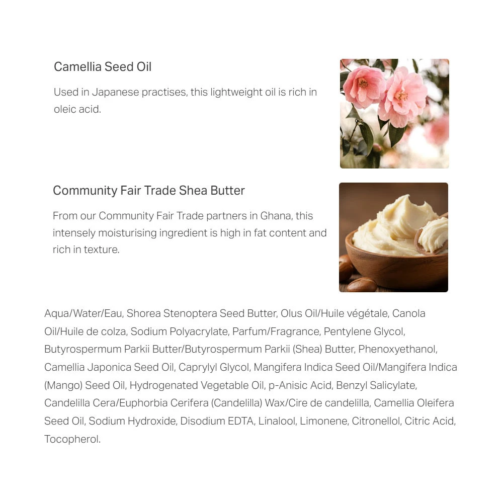 The Body Shop Japanese Camellia Body Cream innehåller kameliaolja, traditionellt använd för sina återfuktande egenskaper. Produkten är berikad med sheasmör som ofta används för att intensivt nära och mjukgöra huden.