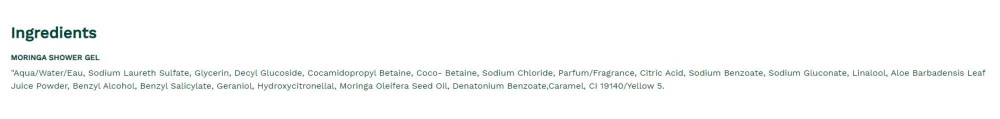 The Body shop Moringa Shower Gel innehåller moringaextrakt, känt för sina antioxidativa egenskaper.Produkten är formulerad utan parabener, silikoner och gluten, vilket gör den lämplig även för personer med känslig hud eller de som föredrar mer naturliga hudvårdsprodukter.