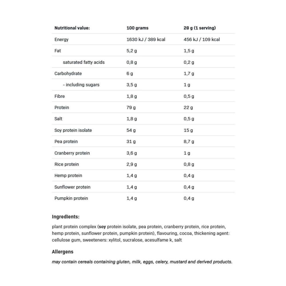 | Ingredienser | acesulfam K, aromer, cellulosagummi, hampaprotein, huvudprotein, kakao, mandelprotein, risprotein, salt, sojaproteinisolat, solrosprotein, sukralos, tranbärprotein, xylitol |