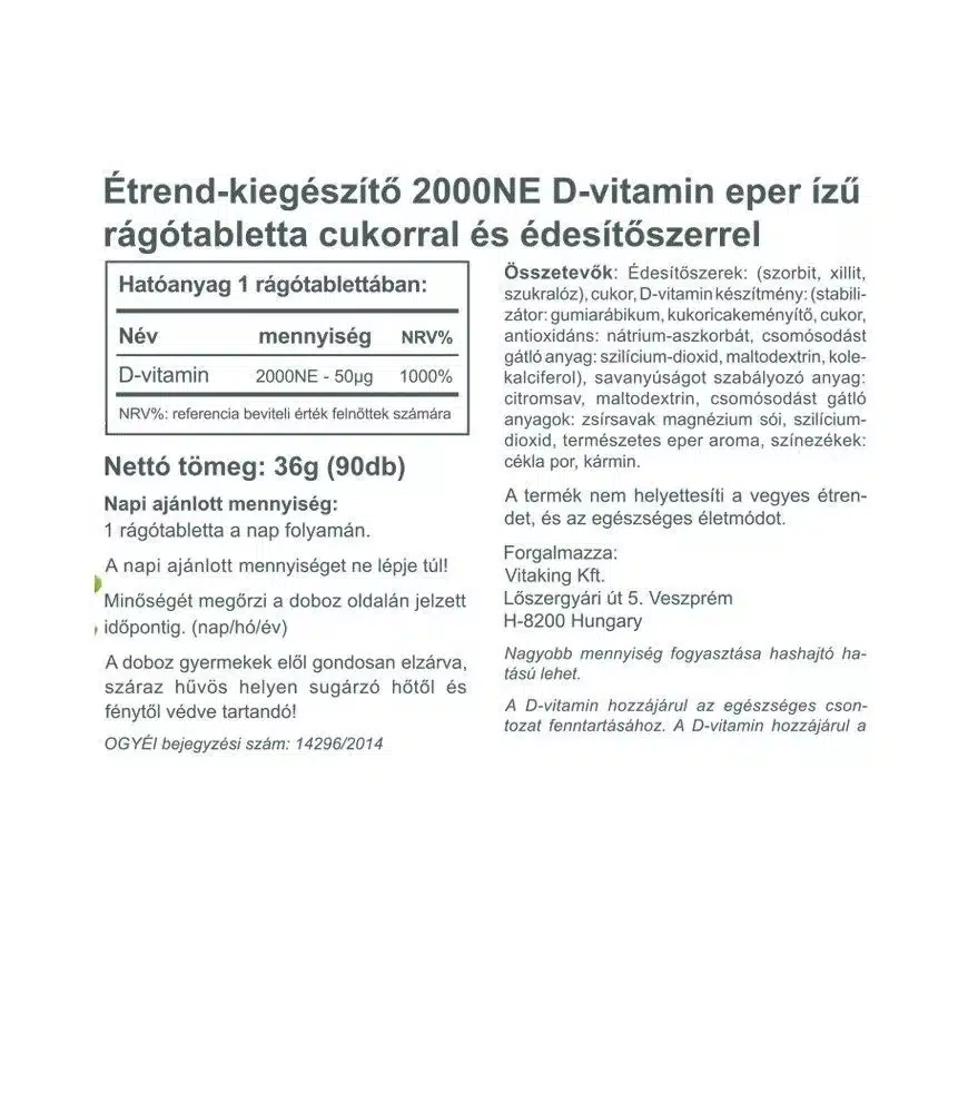 Vitaking Vitamin D3 2000 IU är ett kosttillskott i form av smakrika sugtabletter med jordgubbssmak. perfekt för dig som vill säkerställa ditt dagliga intag av vitamin D på ett enkelt och smakfullt sätt.