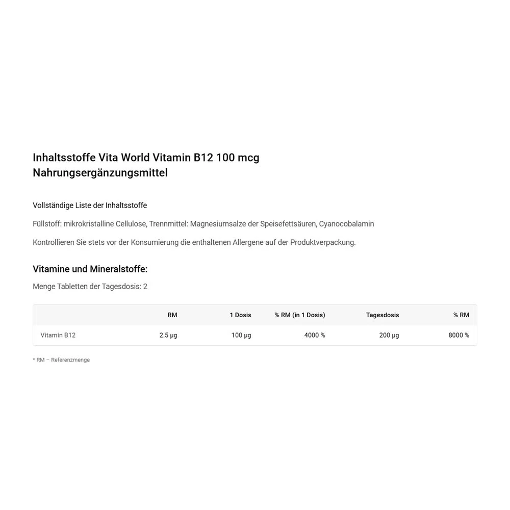 huvudingrediensen i Vitaworld Vitamin B12 100 mcg är vitamin B12 (cyanokobalamin), vilket är essentiellt för flera funktioner i kroppen.